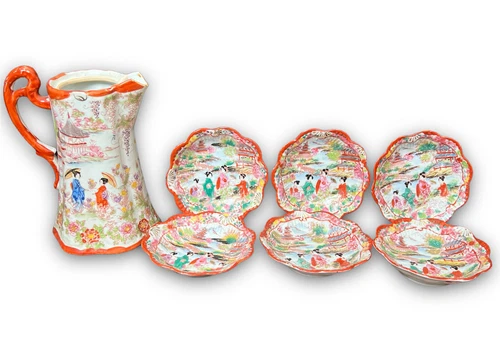 Antique Japanese Geisha Girl Hand Painted Porcelain Chocolate Pot 6 Small Bowls