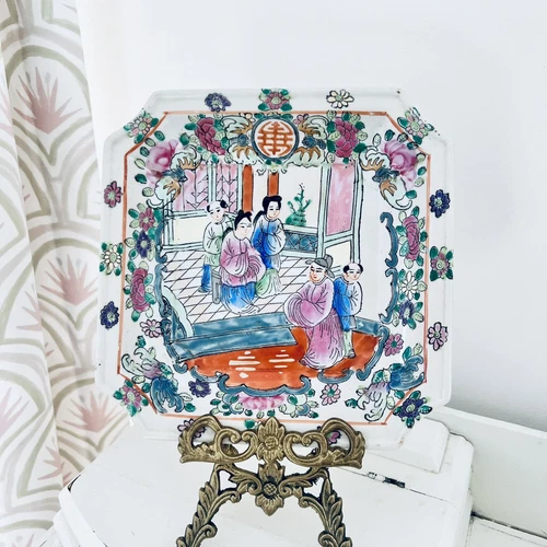 Vtg Chinese Famille Rose Medallion Square 8” Plate Butterfly Chinoiserie Asian