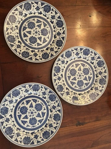 3 Vintage Heavy Chinese 9.5”Plate Chrysanthemum Flowers Blue White Made in China