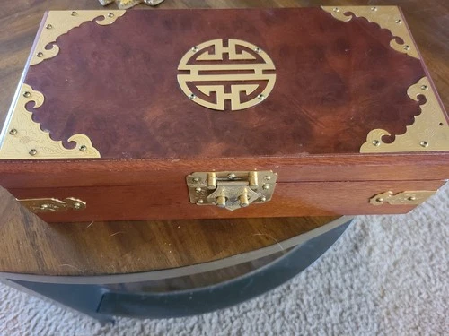 Vintage Chinese Rosewood And Brass Longevity Ring Hinged Jewelry Box With Lock