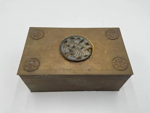 Cigarette Box Brass and Wood With Jade Trinket 6 x 3.5”