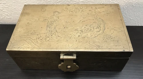 Vintage Chinese Woodlined Brass Box with Engraved Mythological Scene