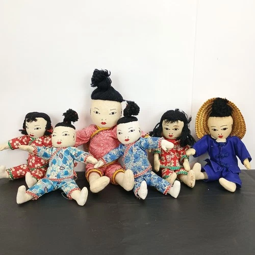Ada Lum Type Vtg Asian Cloth Dolls Marked HONG KONG 6pc Bundle 7" & 10" Handmade