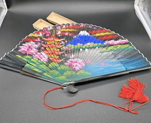 Vintage Japanese Hand Painted Bamboo & Fabric Folding Hand Fan