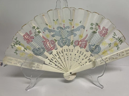 Asian Folding Hand Fan Sheer White Blue Embroidered Ornate Gold Accent Vintage