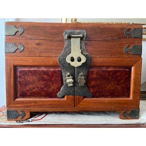 Chinese Burl Wood Jewelry Chest Ornate Brass Hardware Green Silk Lining 9x14x10