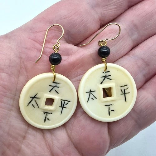 Vintage Chinese Characters Good Luck Coin Style Glass Earrings