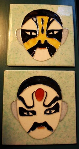 Set 2 Vintage HAND GLAZED CHINESE OPERA MASK FACES Ceramic Art Tiles 6" Square