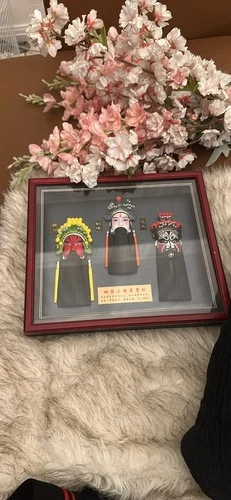 Framed decorative shadow box featuring Chinese opera masks and props.