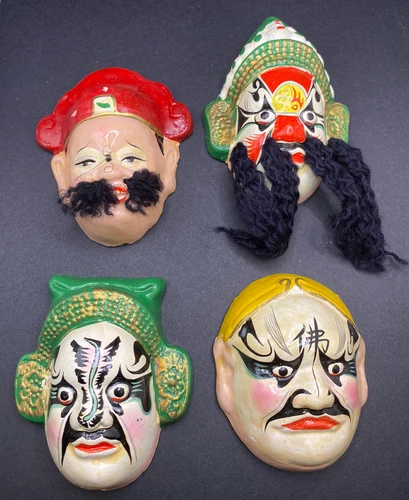 VINTAGE 4 Small Hand painted KABUKI CLAY ORIENTAL MASKS HIGHLY DETAILED W/ Box