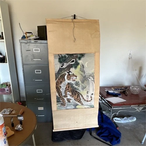 Chinese Handmade Hanging Scroll Tiger Painting with Calligraphy