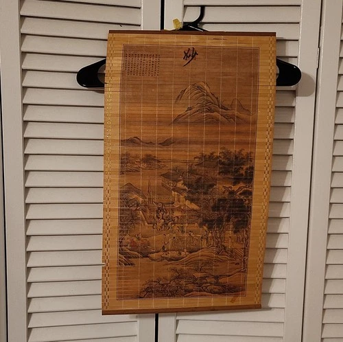Chinese Bamboo Scroll Wall Hanging Landscape Temple Scene with Calligraphy