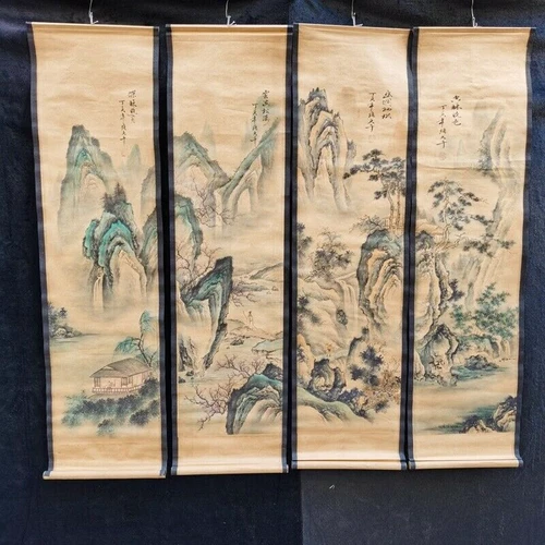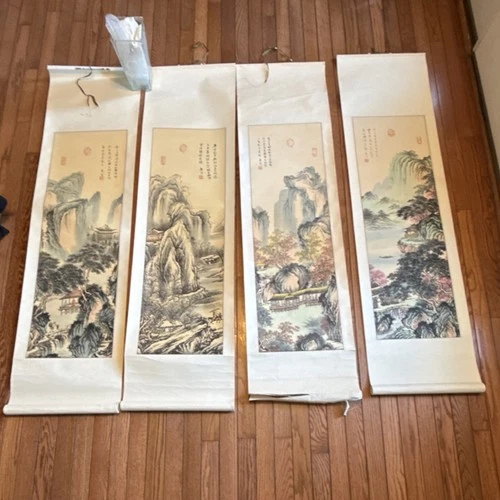 4 Seasons Chinese Landscape Scroll Paintings with Calligraphy, 56" x 14"
