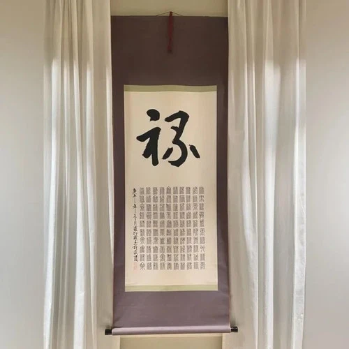 VTG East Asian Hanging Calligraphy Good Fortune Scroll Purple Hand painted Gree