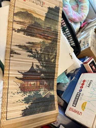 Chinese Bamboo Scroll with Landscape, Figures, Artwork, and Calligraphy