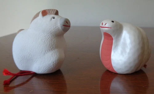 Lot 2 Japanese Zodiac Year of HOSRSE & SNAKE Lucky Bell Dorei Clay Figurines NEW