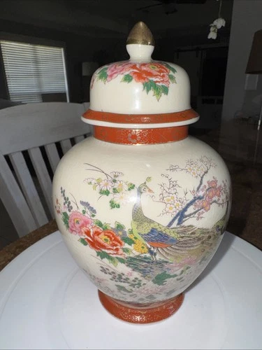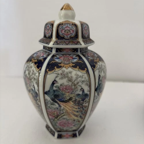 Vintage Japanese Imari Vase Porcelain Ginger Jar & Lid with Peacock & Floral Urn