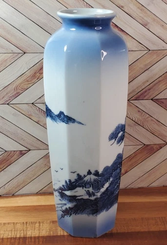 Shiroyama Vintage Mid-Century Japanese Landscape Ceramic Octagonal Vase 11" Tall