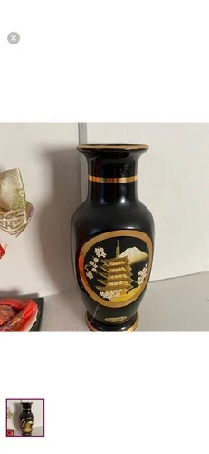 Japanese Black Vase with Pagoda, Mt. Fuji, Cherry Blossoms & 24kt Gold Accents