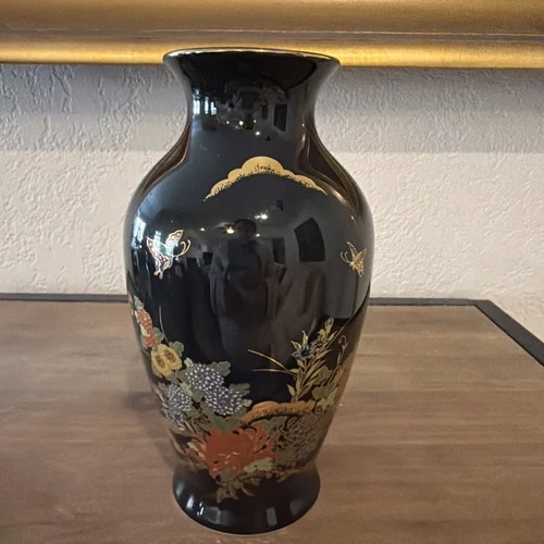 Japanese Hand Painted Vase 9'' Black with Gold Rim & Floral Design - Collectible