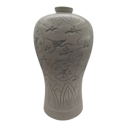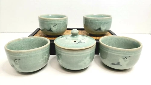 Vintage Korean Celadon Flying Crane Signed Crackle Glaze Tea Cups Stand