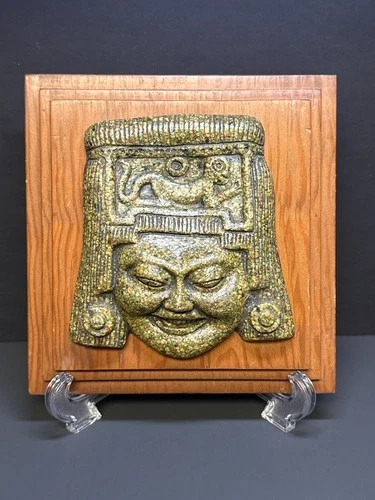 Vtg Mexico Folk Art Green Crushed Malachite Mayan Aztec Head Plaque Zarebski