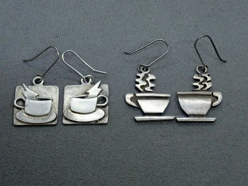 Two Pairs Handmade Southwestern Coffee Tea Cup Sterling Silver Hook Earrings