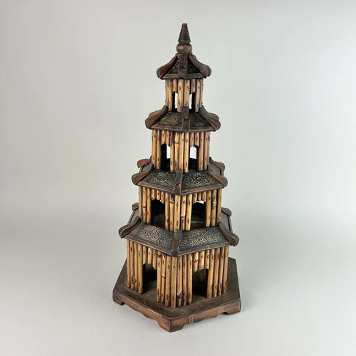 Vintage Wooden Birdhouse Pagoda 21 Inch Tall Bamboo Multi Tier Asian Style