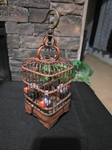Early 1900's Chinese Bamboo Hand Carved Bird Cage with Porcelain Feed Bowls