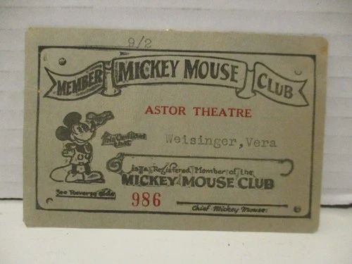 1930s Mickey Mouse Club Membership Member Card Astor Theatre - RARE