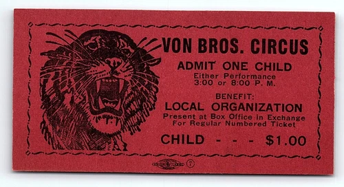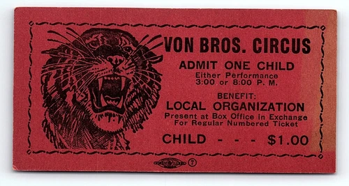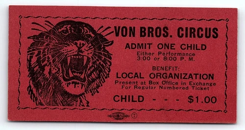 1950s VON BROS. CIRCUS BENGAL TIGER LOCAL BENEFIT CHILD'S TICKET Z1497