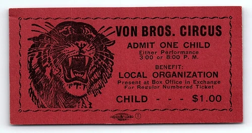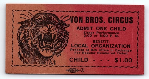 1950s VON BROS. CIRCUS BENGAL TIGER LOCAL BENEFIT CHILD'S TICKET Z1494