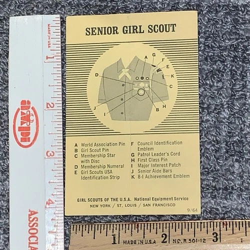 Vintage 1964 Girl Scout Insignia Placement Card – Brownie & Senior Uniform Guide