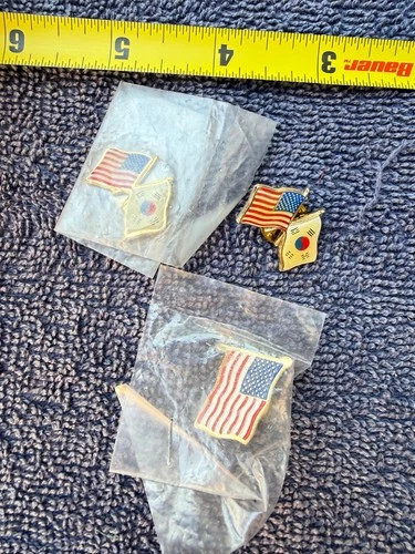 3 Vtg Korea Veteran Lapel Pin – USA & South Korea Flags – Crossed Flag Design