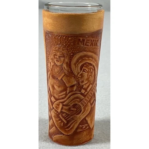 Vintage Rosarito Mexico Leather Wrapped Shot Glass Tooled Embossed Tequila Glass