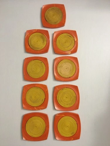 Set Of 9 Lucite Raffia Orange Drink Coasters Barware Swirl Vintage Plastic