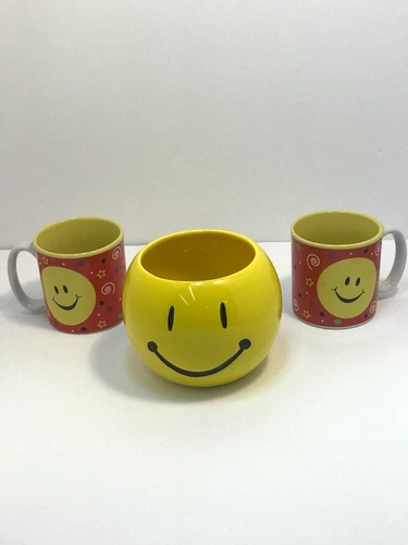 Happy Face Burton 2005 Mugs 2 Red and Yellow Mugs with Yellow Happy Bowl Planter