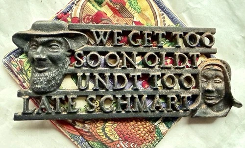 Vintage Heavy Cast Iron Amish Trivet Funny Saying We Get Too Soon Oldt Couple