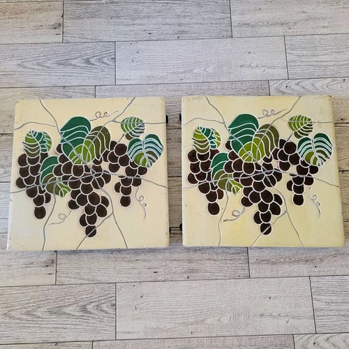 2 Vintage Ceramic tile trivets Grape Vine Footed Etched 6 1/2" Square Hot Pad