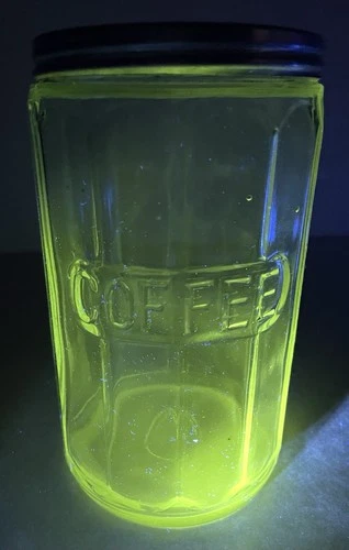 Antique Hoosier Glass Coffee Jar 7” Embossed Manganese Glow Farmhouse Kitchen
