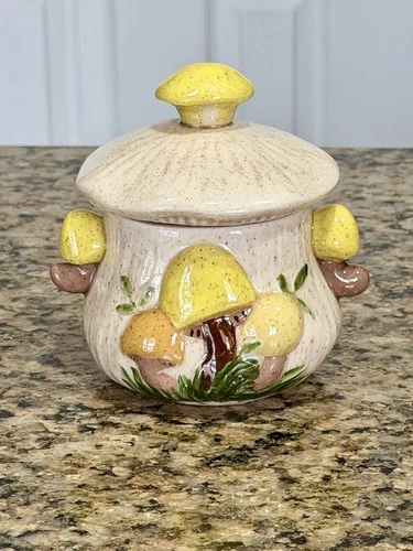 VTG Arnels 1977 Ceramic Mushroom Cookie Jar Canister w Lid 5.25” Retro Woodland