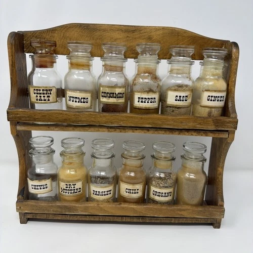 Vintage Spice Rack Wood with 12 Glass Jars Apothecary Cottage Core Farm House