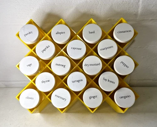Vtg Copco Yellow Spice Jar and Rack Set 18 Glass Jars