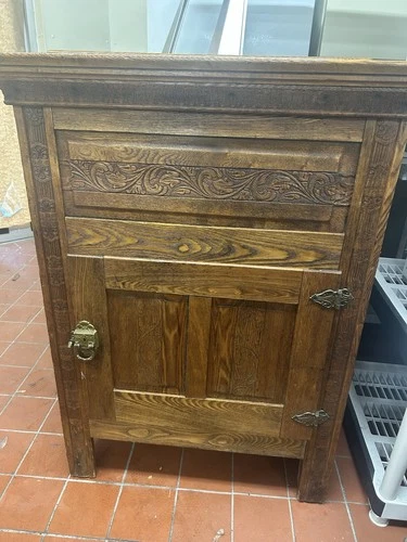 Antique Oak Wooden Ice Box Brown with Ornate Carvings and Metal Hardware