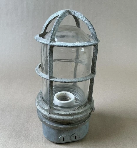 Vintage Gray Metal Industrial Bunker Lamp Cage Glass Wall Light Fixture Outdoor