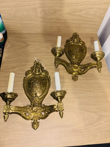 VTG Pair Brass Double Arm Wall Sconces Victorian Style Corset Electric(2)