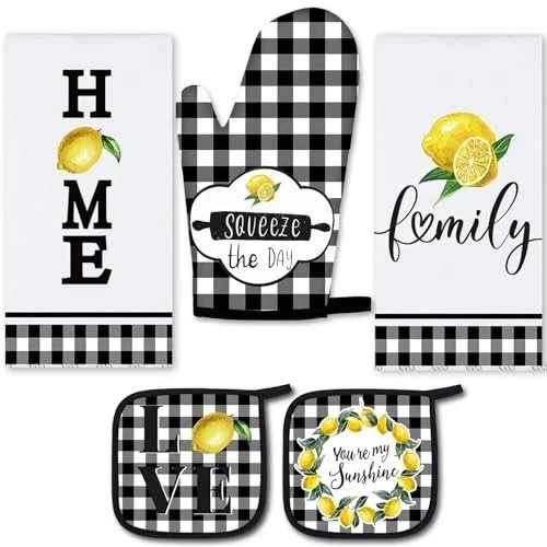 5 Pieces Buffalo Plaid Kitchen Towels Oven Mitts and Pot Holder Set Black Lemon