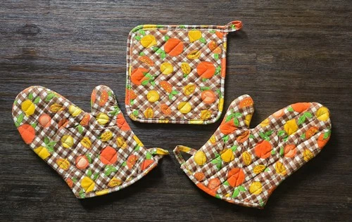 Vintage 70s 80s Oven Mitt Potholder Set Brown Gingham Lemons Oranges Kitchen
