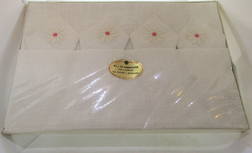 Majestic Creations, 52" X 52" Rayon White Tablecloth with 4 Napkins, New.