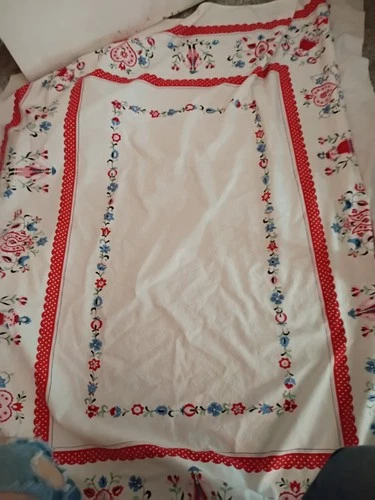 Vintage Folk Art Tablecloth 1950s-70s Red White Blue Scalloped Hearts Flowers...